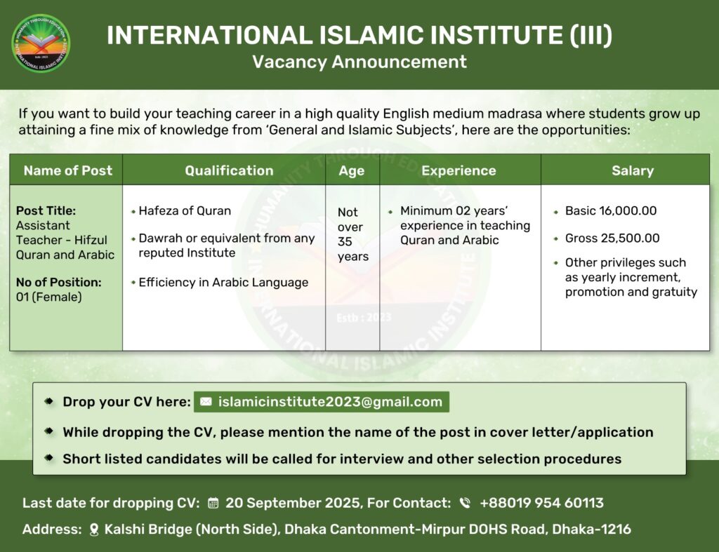 JOB CIRCULAR: ASSISTANT TEACHER-FEMALE (HIFZUL QURAN & ARABIC)